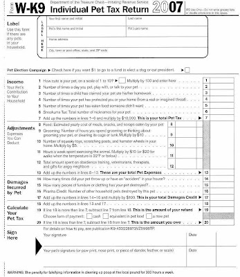 I think for those of us in the dog training and ancillary world of groomers and handlers and Delta Society Evaluators and Pet Therapy Volunteers and veterinarians and vet techs and boutique owners — heck, anyone with a dog in their hearts and lives — I have deduced that the WK9 itemized form makes perfect sense. Now if I can just get the folks at Turbo Tax to slip it into the menu of options and have the IRS approve! Maybe once Barack Obama settles in on the dog of the dreams for his girls (remember Barack, it’s for the girls!), he can push through some legislation to make it so.
