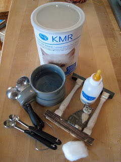 You need nursing powder, nursing bottles, a math brain to mix the formula with water and then the time and patience to feed and “burp” them all by taking a damp paper towel or better yet, a damp cotton ball, and tickling their privates to help them pee and poop the way their mother (oh dear, I just remembered about her again!) would if she were only with them!